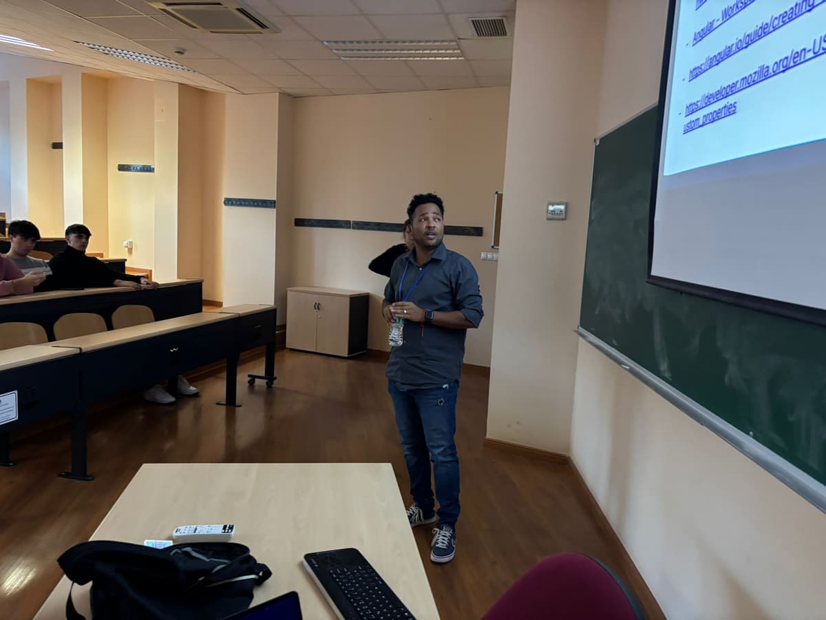 🤖 Tech Talk AI + Frontend with Leifer Mendez in Madrid, demonstrating chatbots built with Gemini, Angular, and Kendo UI.