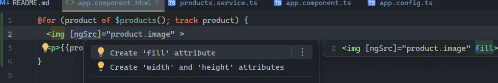 }Open the app.component.html file and change the src attribute to ngSrc. Additionally, implement default width and height attributes.