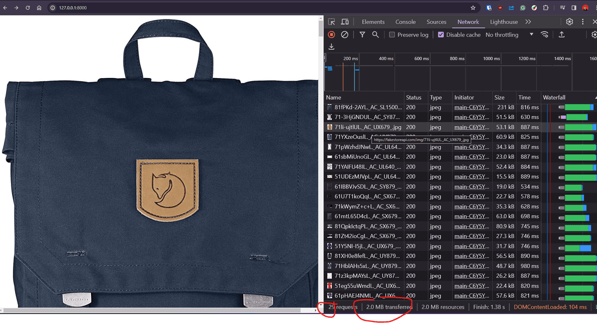 😱 Oh no! It seems we're downloading all the images without the user needing to see them! The images amount to 2MB with 29 requests, taking 1.38 seconds. 😖