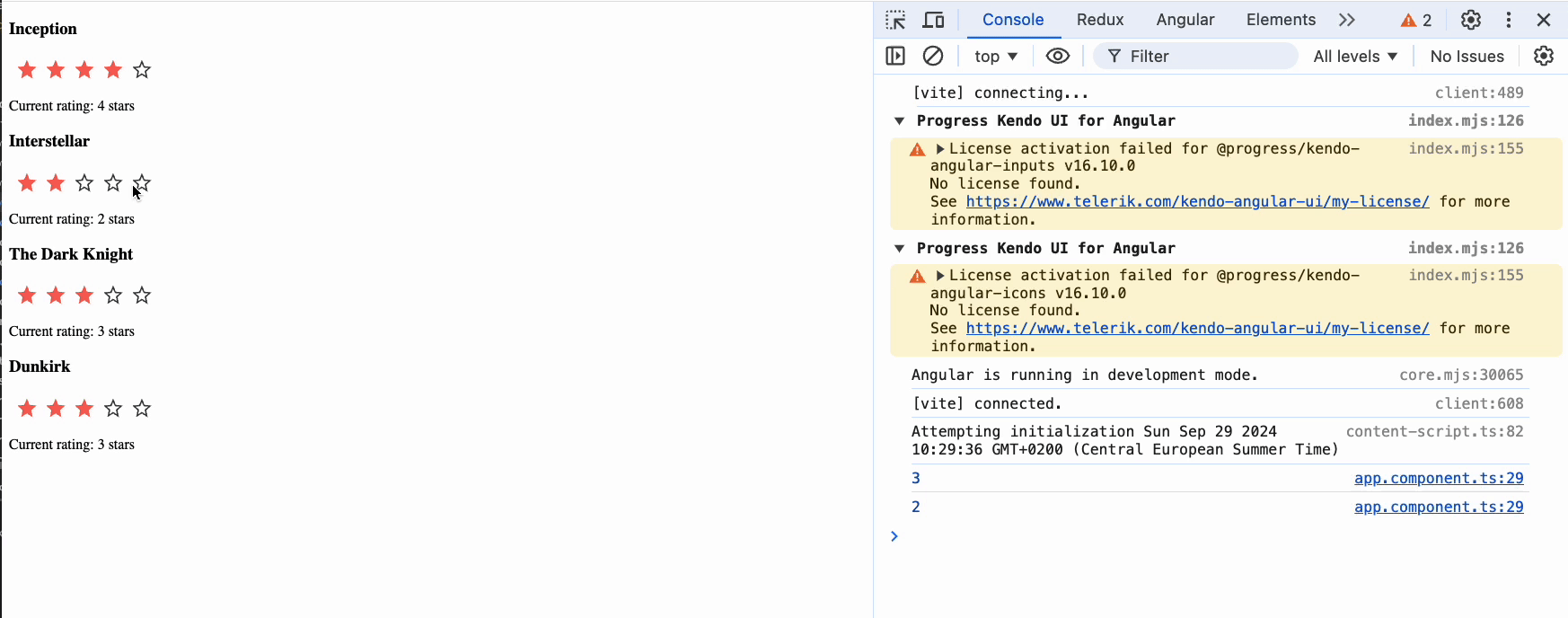 }In the template, we use the kendo-rating component, bind the value property with the rating() signal, and listen to the valueChange event to trigger the onRatingChange event. The final code looks like: