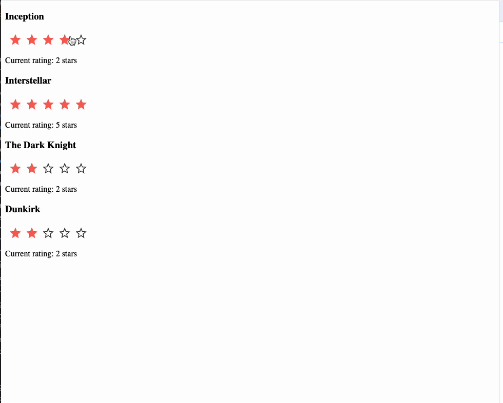 }Save changes and run ng serve to have our app show the list of movies and their ratings. Go to http://localhost:4200 in your browser, and you'll see the list of movies with the rating feature working.