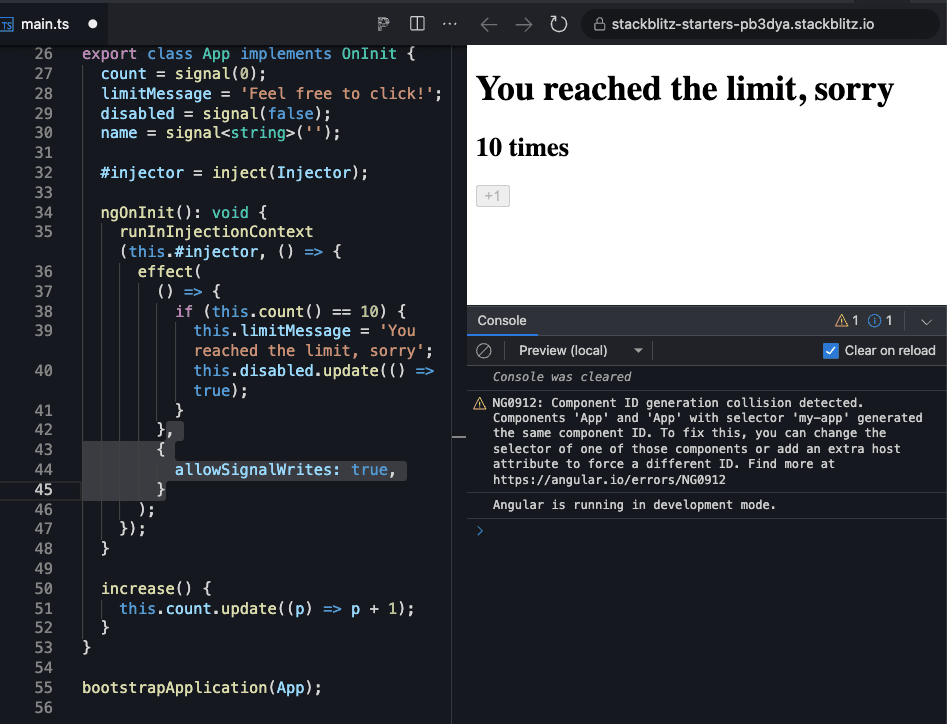 We have a counter app using signals to update the times of clicks, when the count signals variable gets 10, we must update a local variable (no signals) to 'You reached the limit of clicks'.