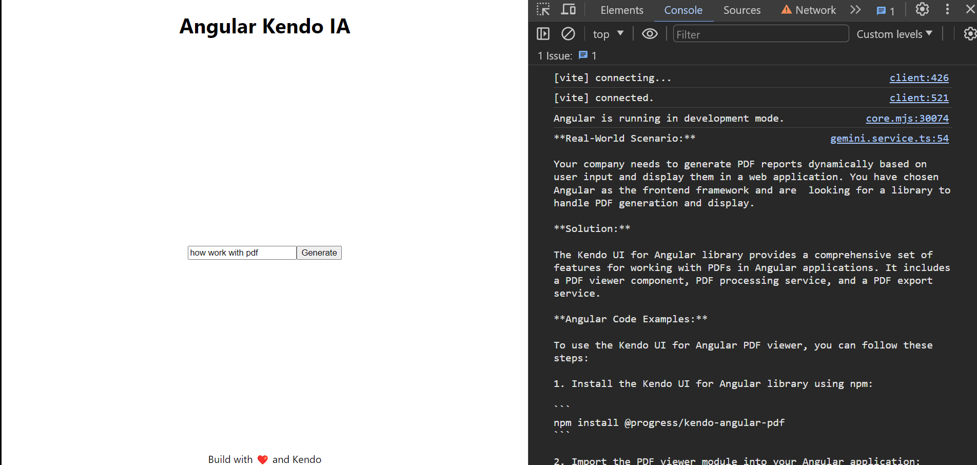 <input #userInput><button (click)="getAnswer(userInput.value)">Generate</button>Save the changes and see our "Kendo IA power by Gemini"! ๐๐