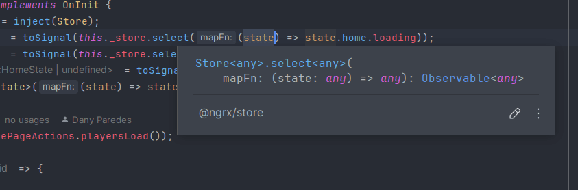 In NgRx, when we want to get data from the store, the easiest way is by using store.select. It allows us to get any slice of the state. Yes, it sounds funny, but any slice returns an Observable<any>.