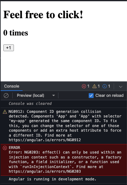 bootstrapApplication(App);We run the effect in the ngOnInit lifecycle to track the changes in the count variables.