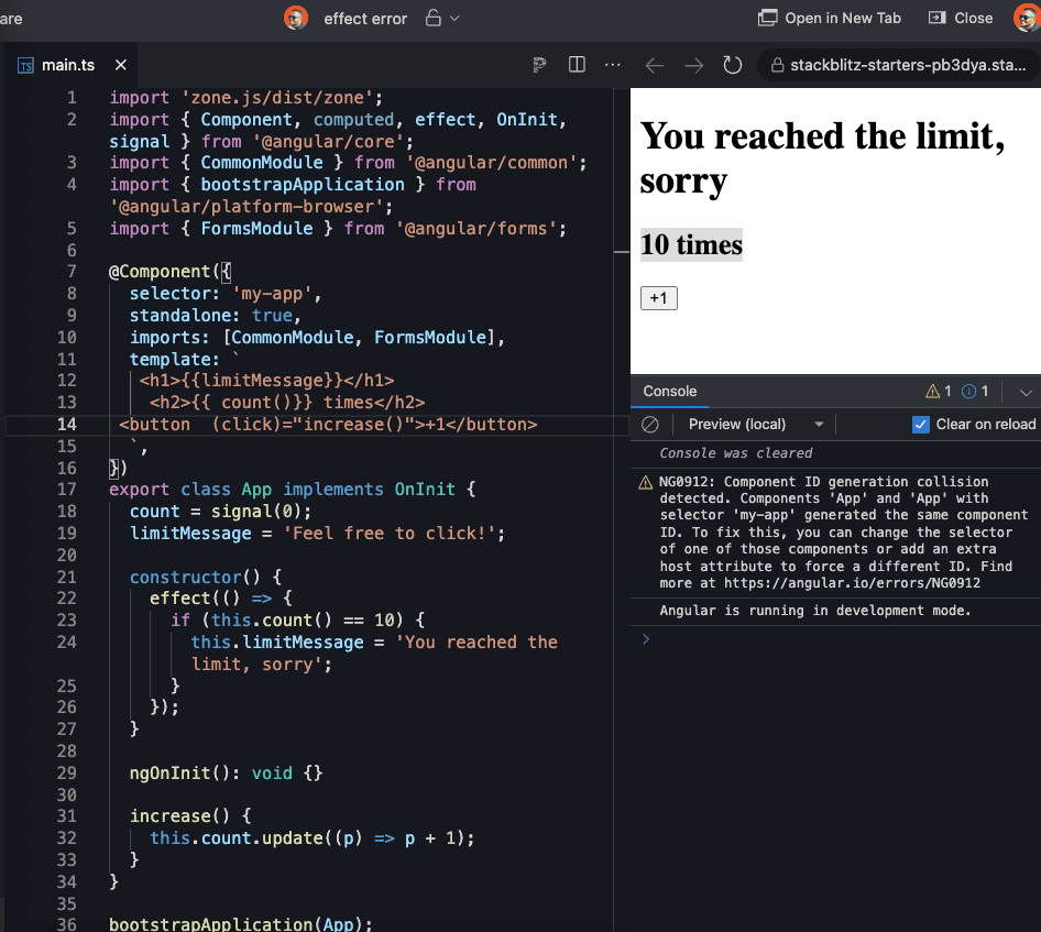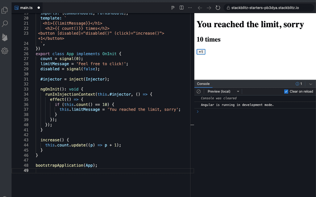 We have a counter app using signals to update the times of clicks, when the count signals variable gets 10, we must update a local variable (no signals) to 'You reached the limit of clicks'.