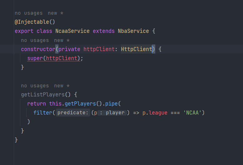 }When we create a new class like NcaaService and extend NbaService, we must provide the constructor dependencies.